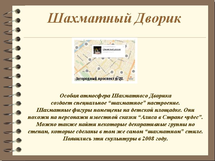 Chess yard A particular atmosphere of this yard creates a special “chess” mood. There are chess pieces placed on the playground. They look like characters of a famous novel “Alice in Wonderland”. One can also find some decorative panels on the walls that are made in the same “chess” style. These sculptures were established in 2008.