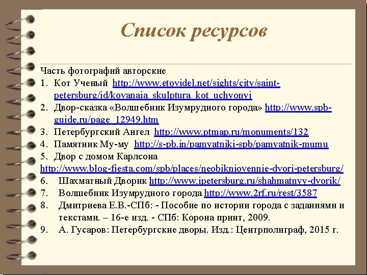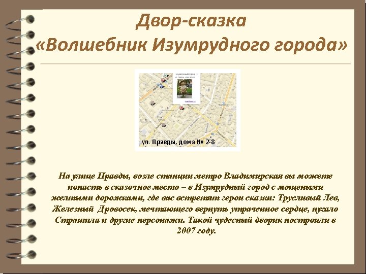 A Fairy tale yard «The Wizard of the Emerald City» This yard on Pravdi street is not far from metro station “Vladimirskaya”. A yellow brick road leads to the Emerald City - the capital of the Land of Oz. On your way you will meet its famous citizens: the Scarecrow, the Tin Woodman, the Cowardly Lion and other characters. This wonderful yard was constructed in 2007. Address: 2 -8, Pravdi street.