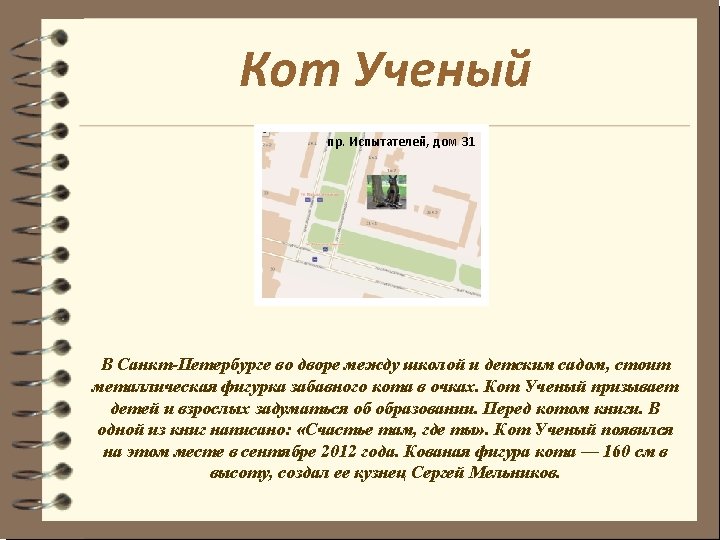 Cat Scientist In St. Petersburg in the yard between the school and kindergarten, there is a metal figure of an amusing cat wearing glasses. It is Cat Scientist encourages children and adults to think about education. There are books in front of Cat Scientist. "Happiness is where you are“ is written in one of the books. Cat Scientist appeared on this site in September 2012. It is 160 cm in height, it was created by Sergey Melnikov.