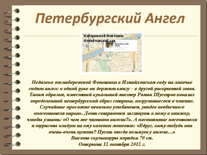 Petersburg Angel Near Fontanka Embankment in Izmailovsky garden, an angel sits on the bench, in one hand he holds a book and in the other - an opened umbrella. Thus, the famous puppet master Roman Shustrov showed a certain Petersburg image of an old reading man. Passers-by smile, seeing this unusual "visitor of the Park". Children try to look to his book to learn: "what are angels reading? " While regular visitors and tourists put coins on his knees: "Perhaps, someone really needs this money. Then the angel lets him take. . . " The sculpture is about 70 cm height. It is open on October 12, 2012.