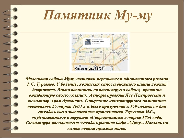 A monument to Mu-mu A small dog Mumu is the personage of an eponymous novel by l. S. Turgenev. At big master's boots and the hanging raincoat the dog lies, it looks sad. This monument symbolizes the dog that is faithfully waiting for his owner. The authors of the project are Lev Nemirovsky and sculptor Aram Arevikyan. This literary monument was open on March 25, 2004 and was dedicated to 150 -th anniversary of the publication of the famous work of I. S. Turgenev, published in Sovremennik magazine in March, 1854. The sculpture settled down next to the entrance of a cozy cafe “Mumu”. Stroke on the dog’s head when passing by.