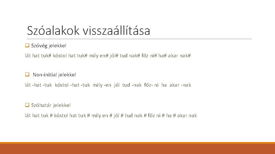 Szóalakok visszaállítása q Szóvég jelekkel lát hat tuk# kóstol hat tuk# mily en# jól# tud nak# főz ni# ha# akar nak# q Non-initial jelekkel lát -hat -tuk kóstol -hat -tuk mily -en jól tud -nak főz- ni ha akar -nak q Szóhatár jelekkel lát hat tuk # kóstol hat tuk # mily en # jól # tud nak # főz ni # ha # akar nak