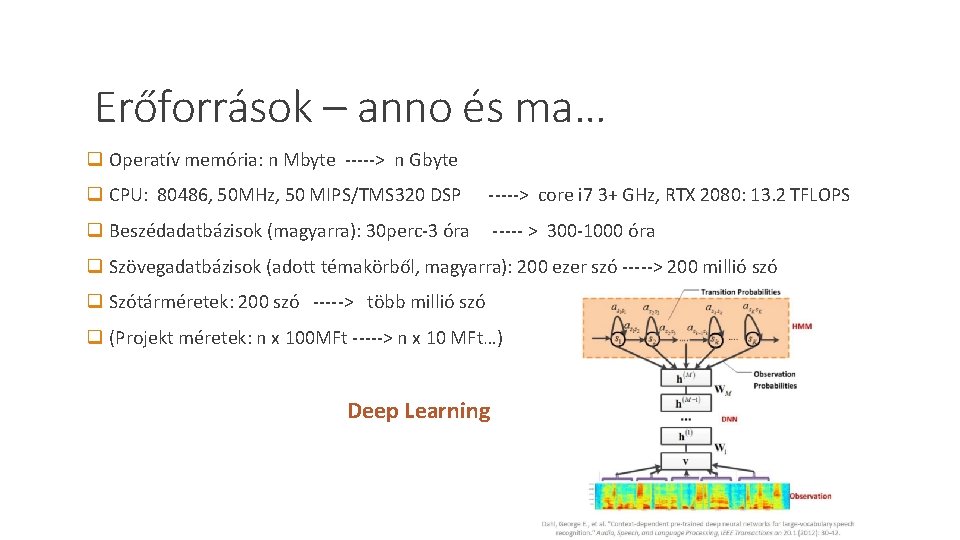Erőforrások – anno és ma… q Operatív memória: n Mbyte -----> n Gbyte q CPU: 80486, 50 MHz, 50 MIPS/TMS 320 DSP -----> core i 7 3+ GHz, RTX 2080: 13. 2 TFLOPS q Beszédadatbázisok (magyarra): 30 perc-3 óra ----- > 300 -1000 óra q Szövegadatbázisok (adott témakörből, magyarra): 200 ezer szó -----> 200 millió szó q Szótárméretek: 200 szó -----> több millió szó q (Projekt méretek: n x 100 MFt -----> n x 10 MFt…) Deep Learning