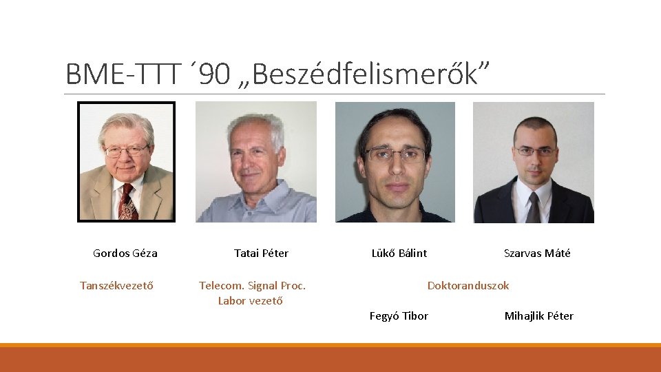 BME-TTT ´ 90 „Beszédfelismerők” Gordos Géza Tatai Péter Tanszékvezető Telecom. Signal Proc. Labor vezető Lükő Bálint Szarvas Máté Doktoranduszok Fegyó Tibor Mihajlik Péter