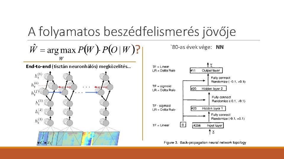 A folyamatos beszédfelismerés jövője ? End-to-end (tisztán neuronhálós) megközelítés… `80 -as évek vége: NN