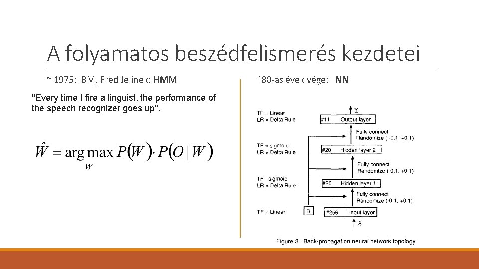 A folyamatos beszédfelismerés kezdetei ~ 1975: IBM, Fred Jelinek: HMM "Every time I fire a linguist, the performance of the speech recognizer goes up". `80 -as évek vége: NN