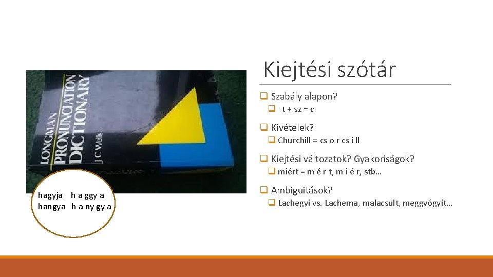 Kiejtési szótár q Szabály alapon? q t + sz = c q Kivételek? q Churchill = cs ö r cs i ll q Kiejtési változatok? Gyakoriságok? q miért = m é r t, m i é r, stb… hagyja h a ggy a hangya h a ny gy a q Ambiguitások? q Lachegyi vs. Lachema, malacsült, meggyógyít…