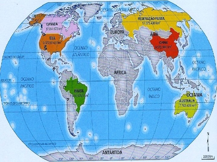 • O território brasileiro possui uma área de 8. 514. 876 km², sendo o quinto maior país do mundo. Em razão disso, é chamado de “país com dimensões continentais”, pois sua área é equivalente à de um continente. • O Brasil está localizado em três hemisférios diferentes: uma pequena parte ao norte, localizada no hemisfério norte; a maior parte no hemisfério sul e todo ele localizado no hemisfério ocidental ou oeste. É cortado ao norte pela Linha do Equador e ao sul pelo Trópico de Capricórnio. • O ponto situado mais ao norte do país é o Monte Caburaí, em Roraima. O ponto mais ao Sul é o Arroio Chuí, no Rio Grande do Sul. A distância entre esses dois pontos é de 4. 394 km. • O ponto situado mais ao leste do país é a Ponta do Seixas, na Paraíba. O ponto mais ao oeste é a Serra Contamana, no Acre. A distância entre esses dois pontos é de 4. 319 km.