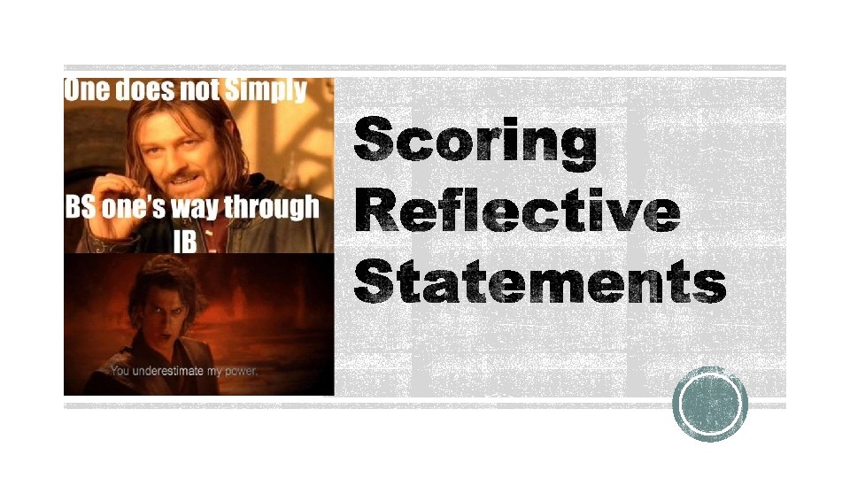 § From another teacher on the OCC- because IB does not give examples of 1 s, here is one from a student in the past that scored a 1. § There are no examiner comments attached to the example. § Why do you think this Reflective Statement scored a 1 out of 3 with the examiners?
