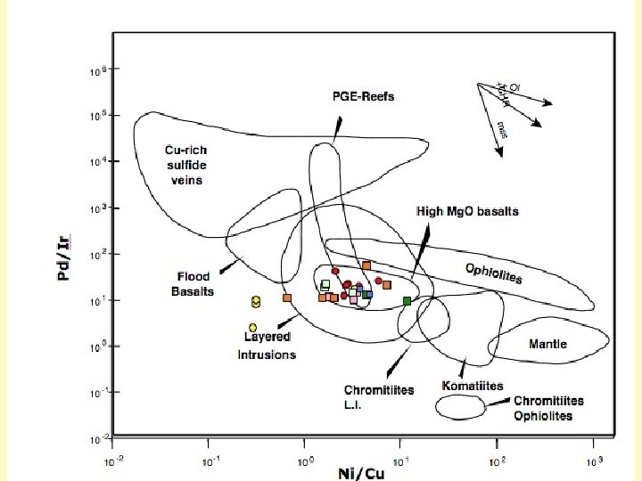 Pd/Ir vs Ni/Cu • The majority of the sulphides plot in the field of high Mg tholeiites • Hence, the ores were formed by a magma that had the same Mg. O content (~12 -13%) as that which the host rocks (Crawford and Keays, 2010) • Magmas that have elevated Mg. O contents are generally sulphide undersaturated and therefore undepleted in Ni, Cu and the PGE • The three MF 81 A samples that lie outside the high Mg tholeiite field are massive sulphides – they have lost some Pd, Pt and Cu during fractionation of the sulphide melt that produced them • Symbols: red circles (MF 19 Assays); pink squares (MF 95); yellow circles (MF 81 A); green squares (MF 93 -sill 1); sky blue squares (MF 93 -sill 2); blue squares (MF 93 -sill 3); orange squares (MF 93 -sill 4)