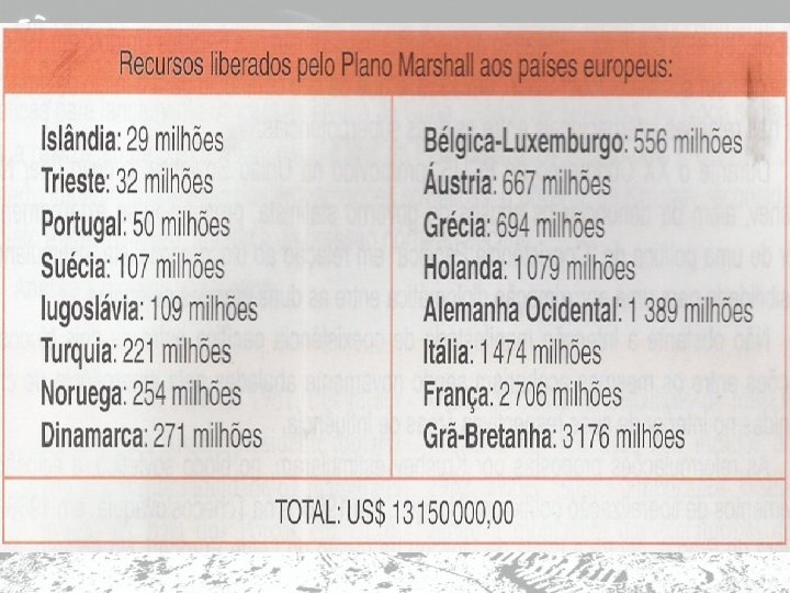 Plano Marshall x Comecon Em 1947, o governo norte-americano destina US$ 13 bi para a reconstrução da Europa Ocidental, como forma de barrar o avanço das ideias comunistas na Europa. Tal apoio financeiro fica conhecido como Plano Marshall. Em 1949, seguindo os moldes do Plano Marshall, a URSS cria o Comecon (Conselho para Assistência Econômica Mútua). • • A Doutrina Truman OTAN versus Pacto de Varsóvia Plano Marshall e a Comecon A Crise de Berlim