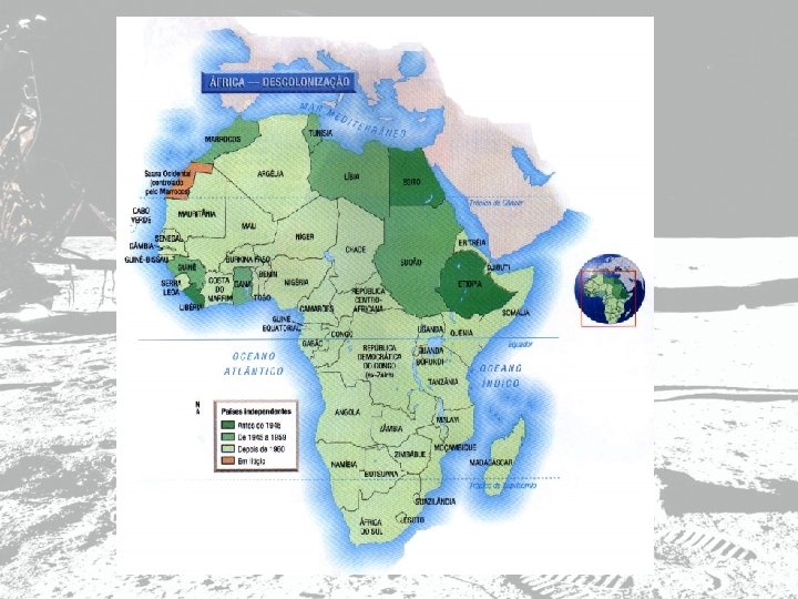 A Descolonização Africana A descolonização da Ásia e África está diretamente ligada ao forte sentimento nacionalista surgido no início do século XX, que se tornou mais forte ao fim da Segunda Guerra Mundial, e seus reflexos. Somando-se a isso, o enfraquecimento das principais potências europeias que colonizaram esses dois continentes. O mapa abaixo representa a divisão desses continentes no pósguerra. Reino Unido Domínios Britânicos França Portugal Espanha Holanda Bélgica Estados Unidos