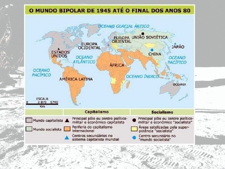 • 1949: OTAN (Organização do Tratado do Atlântico Norte) – aliança militar de países capitalistas. Início: EUA, CAN, ING, FRA, BEL, HOL, LUX, DIN, NOR, FIN, POR, ITA (GRE, TUR e ALE OC. Posteriormente). • 1955: PACTO DE VARSÓVIA – aliança militar de países do leste europeu. Membros: URSS, ALB, ALE OR. , BUL, HUN, TCH, POL, ROM (CUB e MON posteriormente).