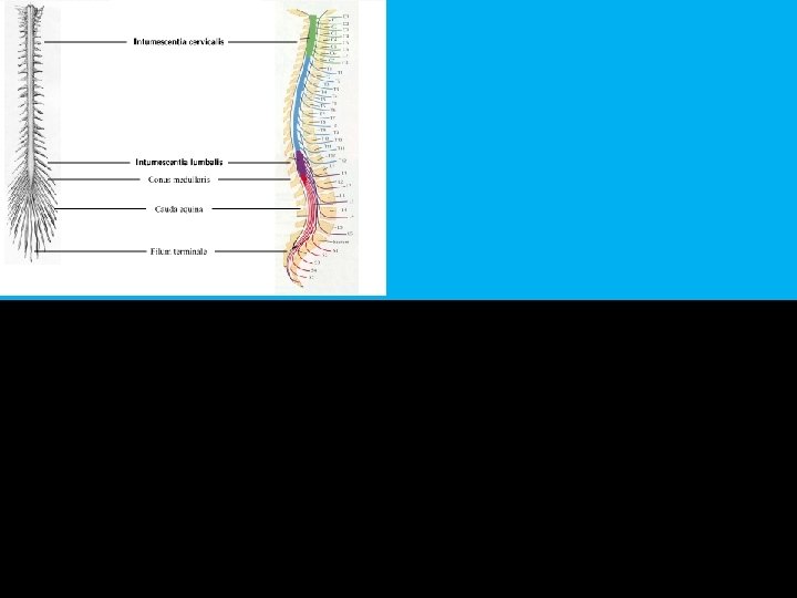 A gerincvelő caudalis vége Conus medullaris: – Vékony, kúpos vége a gerincvelőnek – Felnőtt korban az L 1 -L 2 csigolyák szintjében Cauda equina (lófarok): a megfelelő csigolyaszintekhez futnak a kilépéshez Filum terminale: Cérnavékonyságú kötőszövetes (pia mater) folytatása a conus medullarisnak, amely a coccygealis szalagban végződik