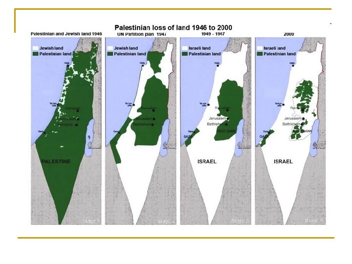 De volta à questão palestina. . . n n O fracasso de Iasser Arafat e da ANP no processo de paz de Oslo e o reforço da ocupação Israelense levaram ao aumento dos grupos de resistência Islâmicos e marxistas(alguns negam o Estado de Israel). Volta ao terrorismo palestino contra civis israelenses