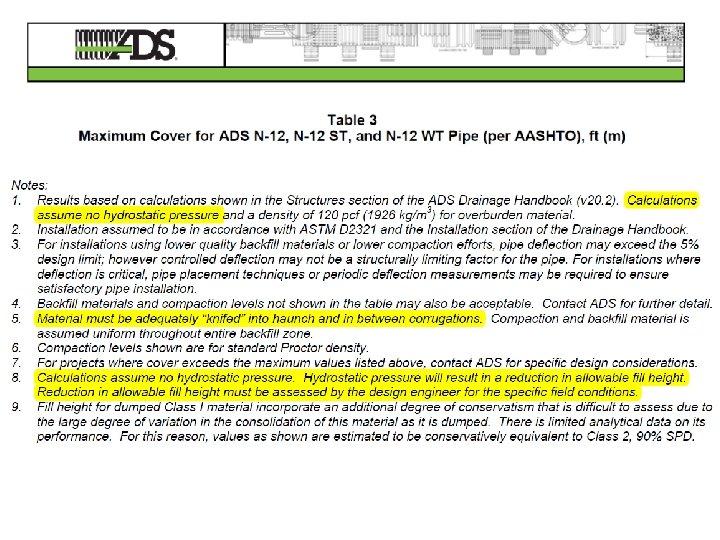34 e. Pipe – Plastic Fill Height Table Pitfalls Water Table Impact: • According to AASHTO LRFD Code 12. 3. 7 – Soil Prism, there are three different equations to utilize in design based on the elevation of the top of pipe relative to the elevation of the water table. • Not knowing this exact project variable for each section of a line, the design engineer cannot use the provided manufacturer fill height tables if water tables are present since this variable is not addressed in the tables.