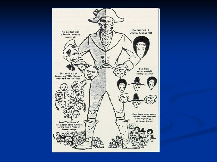 A mentális retardáció tanulmányozása a genealógia segítségével n n A gyengeelméjűségről, okairól, társadalmi és morális következményeiről folytatott viták az 1870 -es és 80 as években kerültek a felszínre. A gyengeelméjűség örökletes természete erőteljes támogatást kapott Richard Louis Dougdale amerikai szociológustól. Dougdale (1841 -1883) tagja volt a New York-i Börtön Egyesületnek, egy genealógiai felmérést készített egy általa Jukes nevű családról. Információkat gyűjtött az eredeti Jukes család 1200 leszármazottja közül 709 -ről. (Az eredeti Jukes, egy amerikai erdőt irtó őstelepes volt. )