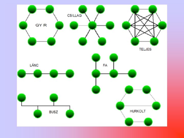 Felépítésük (topológiájuk) ØSín: A hálózatnak van egy gerince(Back. Bone - közös adatátviteli vonal), amihez az összes csomópont csatlakozik. A gerinc mindkét vége ellenállással van lezárva, a rendszer elemei sorba vannak fűzve egy kábelre. Minden csomópontnak egyedi címe van. Olcsó, kevés kábel kell hozzá. Hiba esetén az egész hálózat működésképtelen lesz. ØCsillag: A csomópontok egy közös elosztóba (hub) vannak bekötve. A csillag topológiánál ilyen elosztók gyűjtik össze egy-egy gépcsoport jeleit és továbbítják a központ felé. A csillag topológia előnye az, hogy egy új elosztó beépítésével újabb és újabb gépcsoportokat lehet a rendszerhez kapcsolni. Nem üzenetszórásos (ponttól-pontig). Szakadás esetén megbízhatóbb, sok kábel kell hozzá ezért drága. ØBusz: Sorba fűzött gépek alkotják a hálózatot. Gyakori a helyi hálózatokban, mivel olcsó akialakítása. Hátránya, hogy a kábel megbontása, azaz bármely gép kemelése a hálózatból a hálózat működésképtelenségét eredményezi.