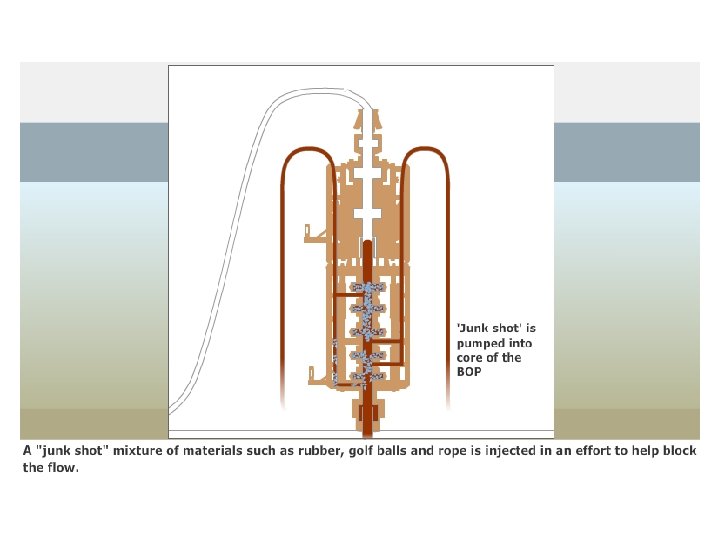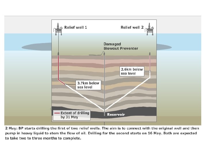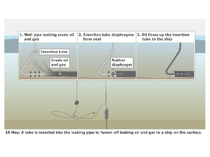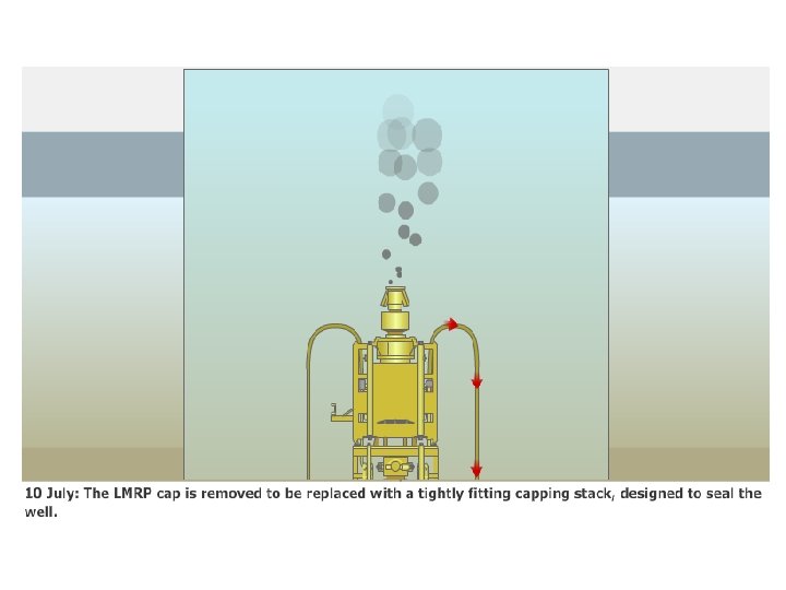 2 JUNE: LOWER MARINE RISER PACKAGE - Continued The next stage was for a diamond wire cutter to saw through the riser close to the LMRP. The blade got stuck and had to be removed but BP eventually cut through the pipe using giant shears manipulated by undersea robots (ROV). After removing the pipe, the cap was lowered onto the LMRP enabling the leaking oil and gas to be funnelled to a drill ship on the surface. Latest estimates suggest more than half of the leaking oil is now being captured.