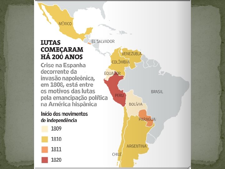 �A Invasão de Napoleão à Espanha Com a invasão de Napoleão e a deposição do rei, o controle da metrópole nas colônias ficou prejudicado, de maneira que os Criollos (não reconhecendo a autoridade de seu novo rei) o irmão de Napoleão Bonaparte, vão administrar a política na colônia com uma certa autonomia