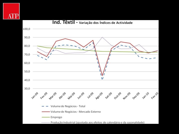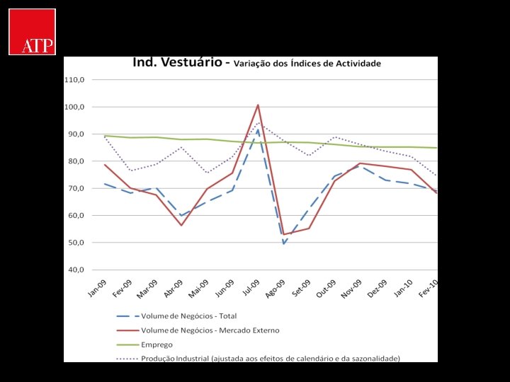 Variação* Homóloga dos Principais Indicadores da ITV Janeiro/Fevereiro 2010 VESTUÁRI TÊXTIL O Volume de Negócios - Total -1, 2% 0, 7% Volume de Negócios - Mercado Externo 3, 8% -2, 5% Volume de Negócios - Mercado Nacional -6, 5% 5, 5% Emprego -8, 0% -4, 4% Remunerações -5, 5% -2, 9% Horas Trabalhadas -7, 9% -7, 3% Horas Trabalhadas (ajustadas de efeitos de calendário) -7, 2% -5, 4% Produção Industrial (ajustada aos efeitos de calendário e da sazonalidade) Preços à Saída da Fábrica -0, 9% -5, 1% -1, 9% -5, 3% -0, 1% TÊXTEIS, VESTUÁRIO, CALÇADO E ARTIGOS DE COURO Volume de Negócios no Comércio a Retalho (deflacionado) Volume de Negócios no Comércio a Retalho (deflacionado e ajustado aos efeitos de calendário e da sazonalidade ) -0, 1% -0, 4% * Média das variações homólogas mensais no período Janeiro a Fevereiro de 2010 (com base nos Índices do INE).
