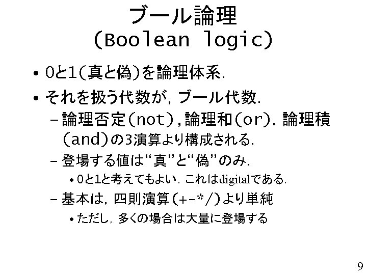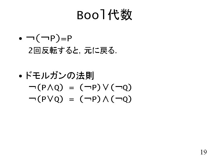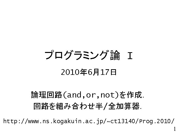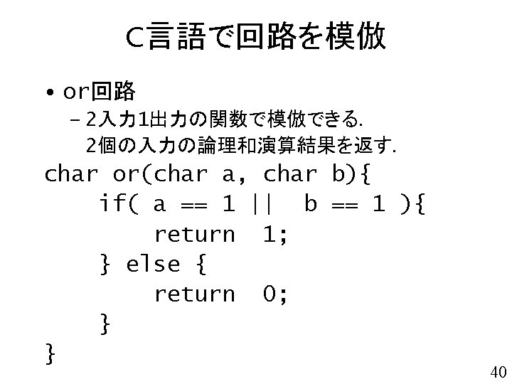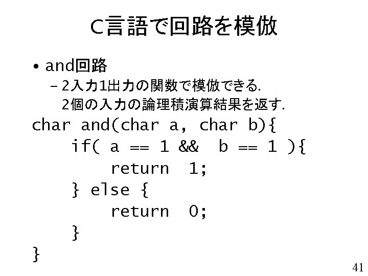 void adder( char a 3, char a 2, char a 1, char a 0, char b 3, char b 2, char b 1, char b 0){ char s 4, s 3, s 2, s 1, s 0; char x, y, z; s 0 = ha_s(a 0, b 0); x = ha_c(a 0, b 0); 4桁2進数同士の 加算回路 s 1 = fa_s( a 1, b 1, x); y = fa_c( a 1, b 1, x); s 2 = fa_s( a 2, b 2, y); z = fa_c( a 2, b 2, y); 注意: 本関数は, 演算結果を返すのではなく 演算結果を表示する. s 3 = fa_s( a 3, b 3, z); s 4 = fa_c( a 3, b 3, z); printf("%d%d + ", a 3, a 2, a 1, a 0); printf("%d%d = ", b 3, b 2, b 1, b 0); printf("%d%d%dn", s 4, s 3, s 2, s 1, s 0); } 49