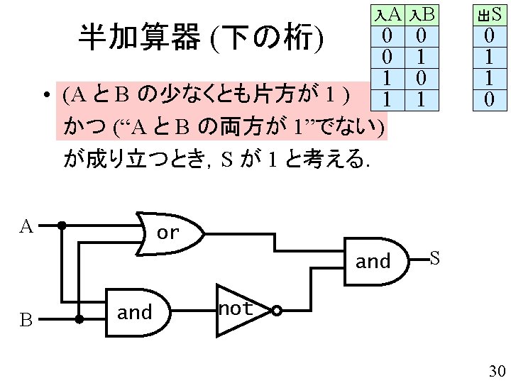 A B or and Y X not and S Z char ha_s(char a, char b){ return and( or(a, b), not(and(a, b)) ); } 1文で書くと. 44