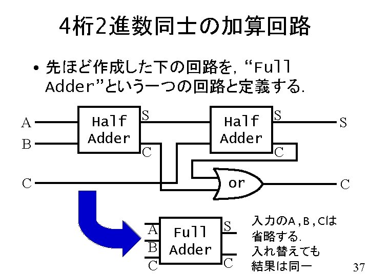 全加算器 (full adder) A B Half S Adder C S C or C 35