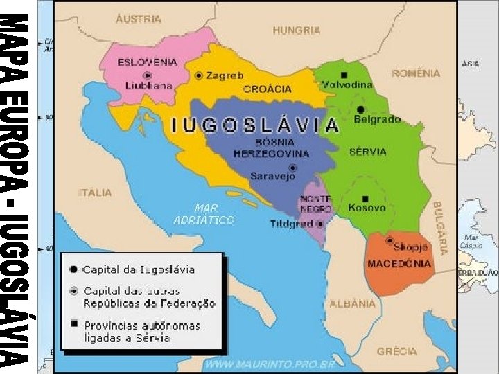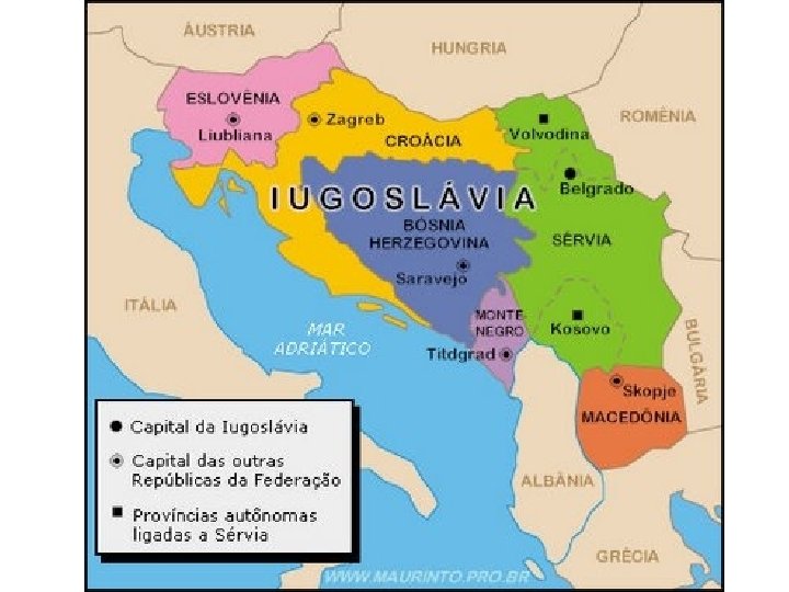 • A IUGOSLÁVIA SE ORIGINOU AO TÉRMINO DA PRIMEIRA GUERRA MUNDIAL, ONDE ALGUNS TERRITÓRIOS QUE PERTENCIAM AI IMPÉRIO AUSTRO-HÚNGARO, À SÉRVIA E A TURQUIA. • MANTEVE-SE UNIDA ATÉ 1945, GRAÇAS AO CARISMA DO MARECHAL JOSIP BROZ TITO. • APÓS A EXPULSÃO DAS TROPAS NAZISTAS NO TERRITÓRIO IUGOSLAVO DURANTE A SEGUNDA GUERRA MUNDIAL, TITO PROCLAMOU A REPÚBLICA SOCIALISTA FEDERATIVA DA IUGOSLÁVIA, QUE AGRUPAVA SEIS REPÚBLICAS: SÉRVIA, MONTENEGRO, ESLOVÊNIA, CROÁCIA, MACEDÔNIA E BÓSNIA-HERZEGOVINA.