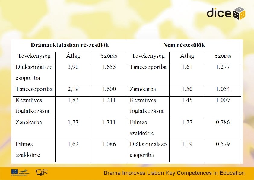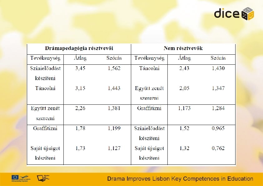 Önálló kvalitatív kutatások az egyes országokban Önbeszámoló Programvezetők önértékelése Öt kulcskompetencia, moderátor és mediátor változók Tanárok megfigyelése Európai szakértők beszámolói Vizsgált dramatikus tevékenységek tulajdonságai Csoport. Külső szakértő megfigyelés értékelése