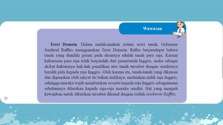 Tadi adalah gambar Kebun Raya Bogor merupakan salah satu pusat pengetahuan yang menyimpan berbagai jenis tanaman. Tahukah kalian bahwa kebun raya tersebut sudah dibangun sejak awal abad XIX? Kebun Raya Bogor merupakan salah satu bukti pengaruh kekuasaan Inggris di Indonesia. Bagaimana Inggris dapat menguasai Indonesia? Pada masa tersebut meletus perang di Eropa antara Prancis dan Belanda. Willem V dari negeri Belanda berhasil lolos dari serangan Prancis dan melarikan diri ke Inggris. Willem V kemudian mengeluarkan maklumat yang memerintahkan para pejabat jajahan Belanda menyerahkan wilayahnya kepada Inggris. Maklumat ini dimaksudkan agar jajahan Belanda tidak jatuh ke tangan Prancis. Saat Inggris menguasai Indonesia, Gubernur Jenderal Lord Minto membagi daerah jajahan Hindia Belanda menjadi empat gubernement, yakni Malaka, Sumatra, Jawa, dan Maluku. Lord Minto selanjutnya menyerahkan tanggung jawab kekuasaan atas seluruh wilayah itu kepada Letnan Gubernur Thomas Stamford Raffles.