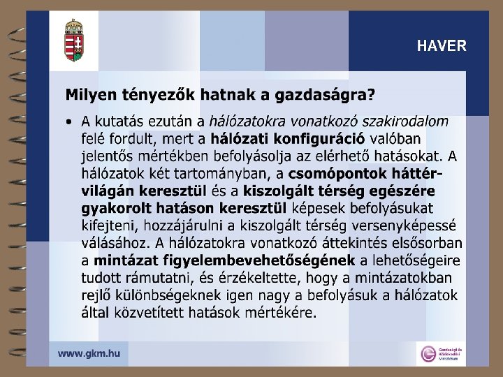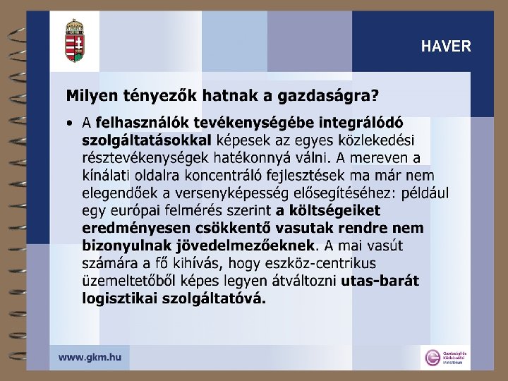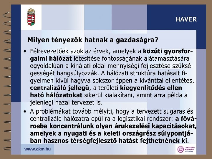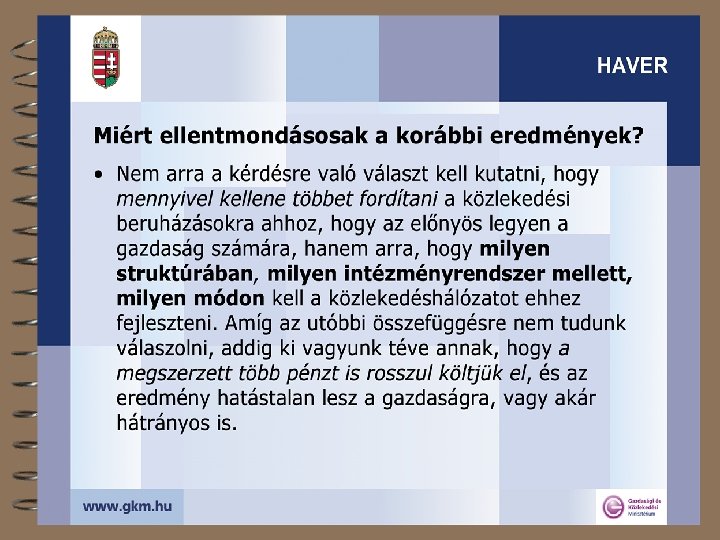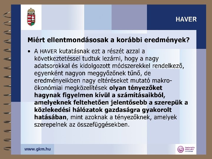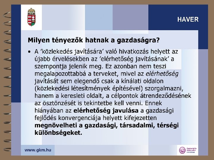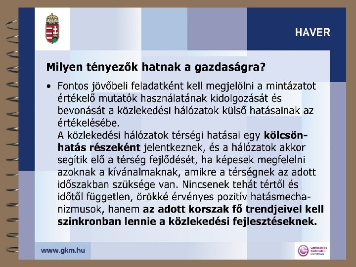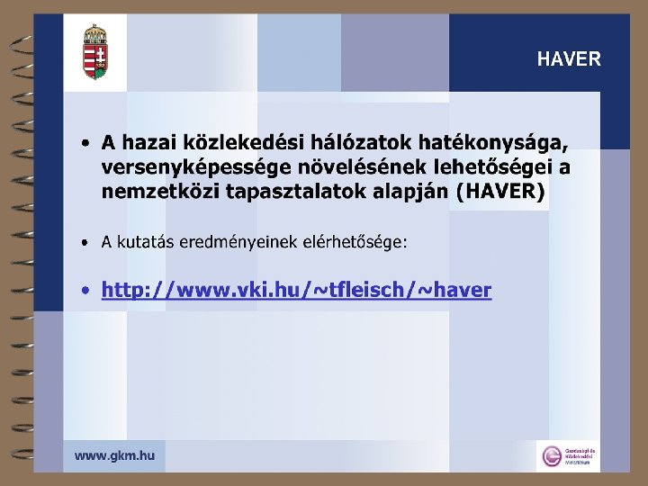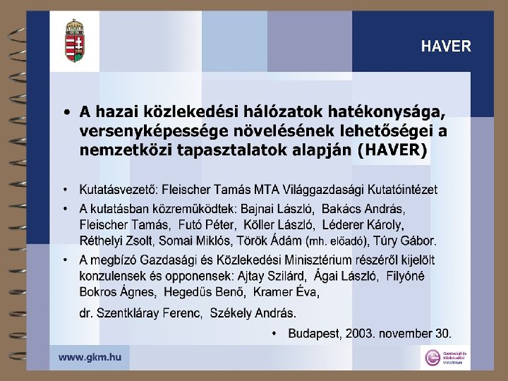A közlekedési hálózatok térségi szerepéről 4 Lefedett terület, igénybe vett terület, térségi hatás 4 A fenntarthatóság térbeli dimenziója 4 Mit tehet a közlekedési hálózat? 4 A transzeurópai hálózatokról + 4 Az egységesség kérdőjelei 4 A tanulságok összefoglalása 4 „A HAzai közlekedési hálózatok HAtékonysága és VERsenyképessége növelésének lehetőségei a nemzetközi tapasztalatok alapján” (HAVER) 2003
