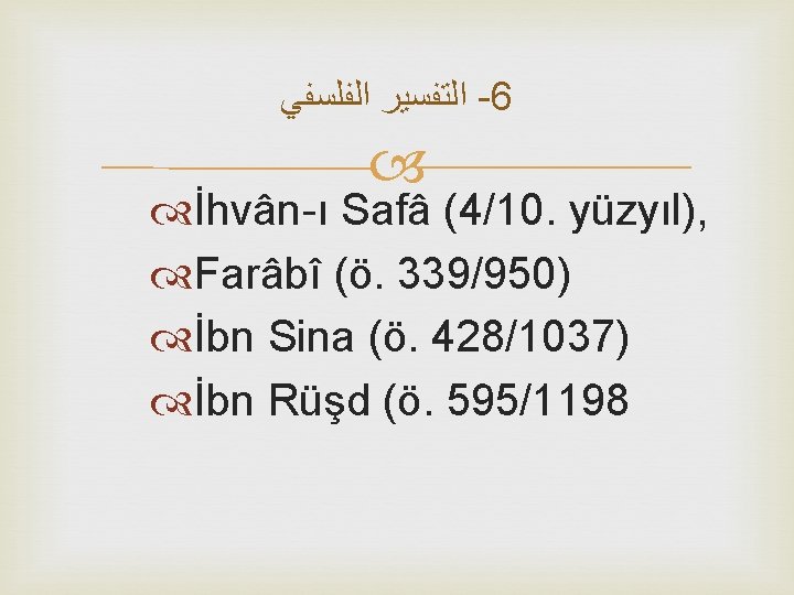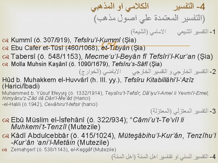 ﺍﻻﺷﺎﺭﻱ ﺍﻭ ﺍﻟﺼﻮﻓﻲ ﺍﻟﺘﻔﺴﻴﺮ -3 Sehl b. Abdullah Tusterî (ö. 283/896), Tefsiru’l-Kur’âni’l-Azîm Ebû Abdirrahman es-Sülemî (ö. 412/1021), Hakâiku't-Tefsîr Ebu’l-Kasım el-Kuşeyrî (ö. 465/1072), Letâifu’l-İşârât Necmüddin ed-Daye (ö. 654/1256), Bahru’l-hakâik ve me‘ânî fî tefsîri seb‘i’lmesânî (et-Tevîlâtu’n-Necmîyye) (Aynu’l-hayât adıyla Necmüddin el-Kübrâ’ya (ö. 617/1220) atfedilmesi yanlıştır) Muhyiddin İbnu’l-Arabî (ö. 638/1240), Fusûsu’l-Hikem; Fütûhâtu’l-Mekkiyye; Rahmet mine’r-Rahmân fî’t-tefsîr ve işârâtu’l-Kur’ân Abdurrezzak Kemaleddin el-Kaşanî (ö. 730/1329), Tevilâtu’l-Kur’ân (Te’vilât-ı Kâşâniyye) Nisaburî (ö. 850/1447), Garaibu’l-Kur’an ve Reğaibu’l-Furkan Baba Nimetullah Nahcivânî (ö. 920/1515), el-Fevâtihu’l-İlâhiyye ve’l-Mefâtihu’l. Gaybiyye İsmail Hakkı Bursevî (ö. 1138/1725), Rûhu’l-Beyân İbn Acibe (ö. 1224/1809), Bahru’l-medîd Alûsî (ö. 1270/1854), Rûhu’l-meânî