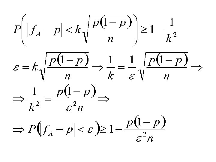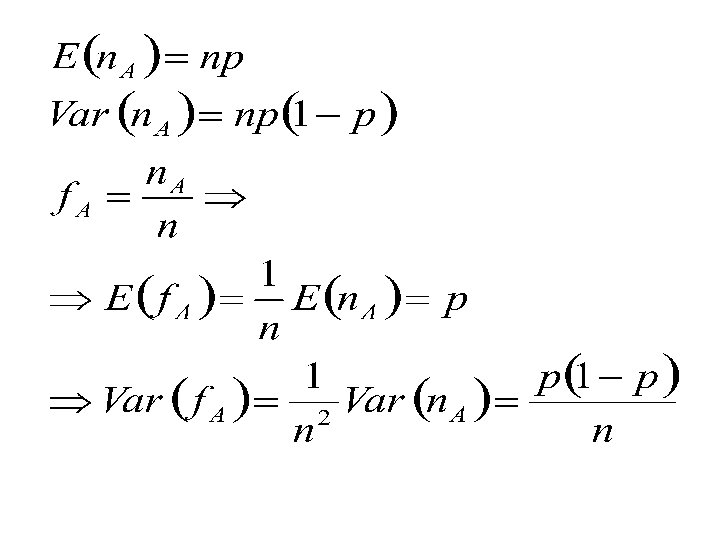• Podemos demonstrar esta lei usando a desigualdade de Tchebycheff que nos foi apresentada anteriormente. • n. A é uma variável aleatória binomialmente distribuída. O evento A é uma dicotomia. Pode ocorrer ou não. • f. A também é uma variável aleatória e aplicaremos a desigualdade de Tchebycheff a ela.