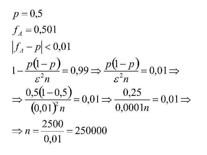 • Cabe lembrar que f. A é uma variável aleatória e se jogarmos a moeda 250000 vezes ela estará ou não a menos de 0, 01 de 1/2. • O que o exemplo anterior garante é que eu tenho no mínimo 99% de chance de ter este resultado ao jogar a moeda 250000 vezes. • Isto, é. A cada ocasião que eu jogar a moeda 250000 vezes, cerca de 99% destas ocasiões terá a frequência relativa de sucessos diferenciando 0, 01 da probabilidade teórica.