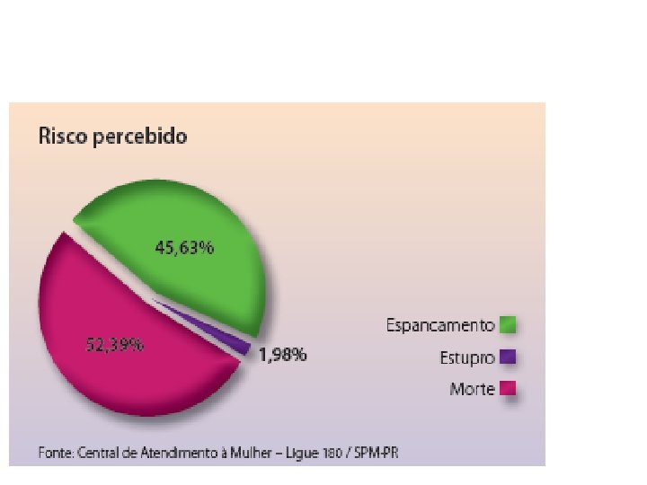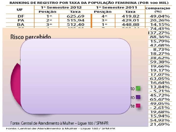 Também em 2011, foram relatados, no total, quase 75 mil casos de violência contra a mulher, seja física (61, 3%), psicológica (24%) ou moral (10, 9%). Fonte: IBGE (Instituto Brasileiro de Geografia e Estatística), na amostra Síntese de Indicadores Sociais.