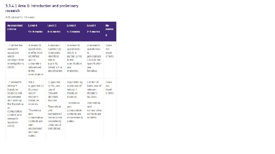 Non-exam assessment mark scheme guidance Level 4 • Detailed, effective, thorough, complete, well-developed. • The research question(s) will be effectively identified and preliminary research will be thoroughly undertaken with wellunderstood and well-stated contexts. • The methods of field investigation will be detailed and thorough with reasoned justification. • The methods of critical analysis will be effective, developed and complete. • The conclusions and evaluation will be thorough, effective and complete and the presentation will be logical and coherent. Level 3 • Clear, secure, explicit, focused, precise, consistent. • The research question(s) will be securely identified and preliminary research will be focused with consistently understood and stated contexts. • The methods of field investigation will be clear and relevant with explicit justification. • The methods of critical analysis will be clear, precise and consistent. • The conclusions and evaluation will be clear, secure and focused and the presentation will be clear and precise. Level 2 Intermittent, partial, some, implicit, imprecise, inconsistent. The research question(s) will be partial and preliminary research will be imprecise with inconsistently understood and stated contexts. The methods of field investigation will be intermittently applied with only some aspects justified. The methods of critical analysis will be imprecise, partial and inconsistent. The conclusions and evaluation will be partial and inconsistent and the presentation will be incomplete. Level 1 Basic, limited, tentative, generalised, isolated. The research question(s) will be generalised and preliminary research will be limited with only isolated contexts. The methods of field investigation will be basic and limited in scope with tentative justification. The methods of critical analysis will be basic, limited and tentative. The conclusions and evaluation will be limited and generalised and the presentation will be basic.