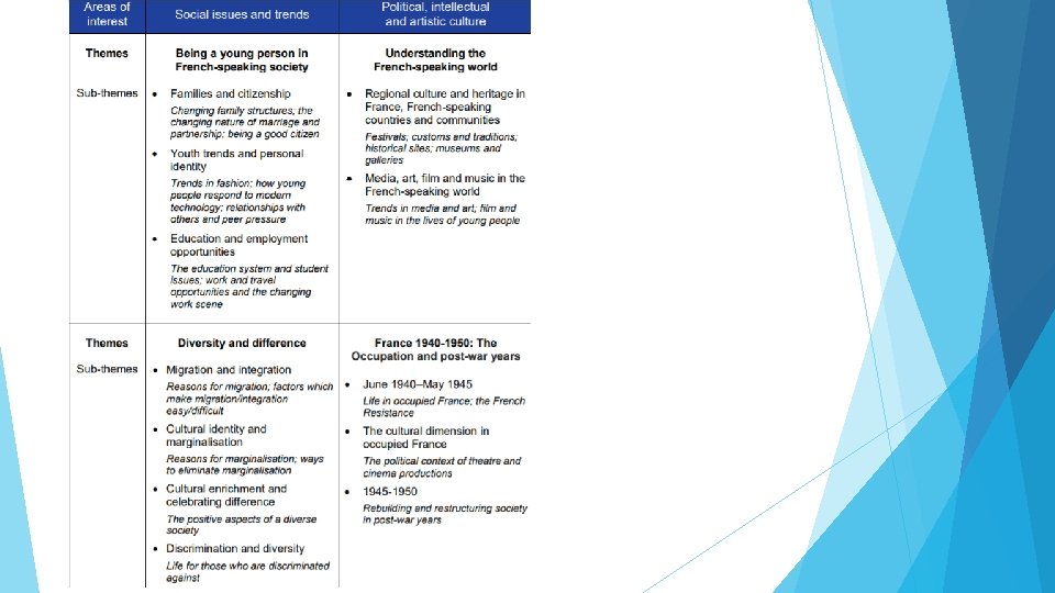 What do we expect of you? • Recommended grade 6 at GCSE. • Commitment to the language you’ve chosen and a “self-start” attitude to exploring the culture of the language that you are studying. • That you TALK! • Organisation – you will have several teachers who focus on different aspects of the course – keeping your notes in order is essential for reference later. • Commit to languages as a two-year course – especially when considering how language learning works. • To be ready to discuss your views on topics you may never have reflected upon before.