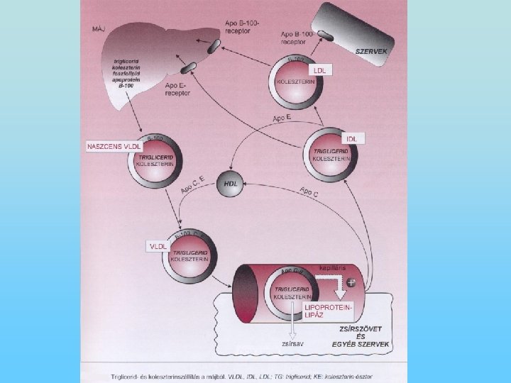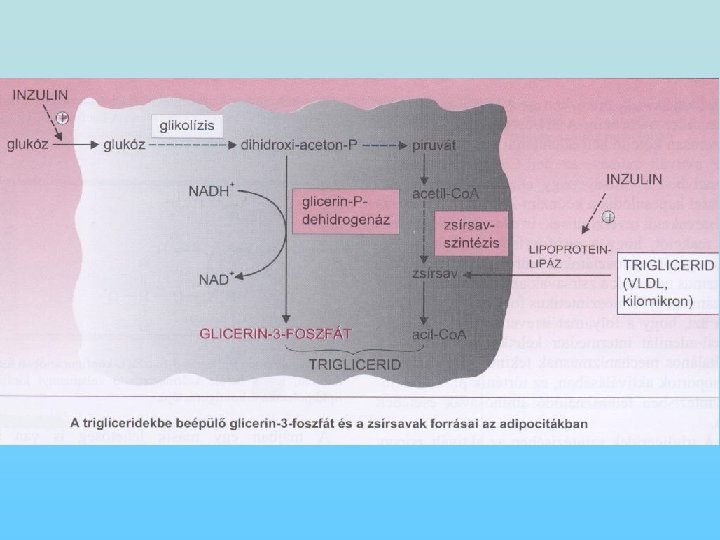 A trigliceridek szintézise • A trigliceridek szintézise során lizofoszfatidsav keletkezik dihidroxi-aceton-foszfátból. • A lizofoszfatidsavból kialakul a foszfatidsav, melyről a foszfátcsoport lehidrolizál és diglicerid keletkezik, ami acil. Co. A-val trigliceriddé alakul. • A zsírszövet a trigliceridek szintézisére, raktározására és mobilizálására specializálódott szövet. • A triglicerideket lipoproteinek (VLDL) szállítják a zsírszövethez, ahonnan lipoprotein-lipáz szabadítja fel a zsírsavakat és az adipociták felveszik. • A zsírszövet glükózt csak inzulin jelenlétében képes felvenni, s inzulin aktiválja a lipoprotein-lipázt is.
