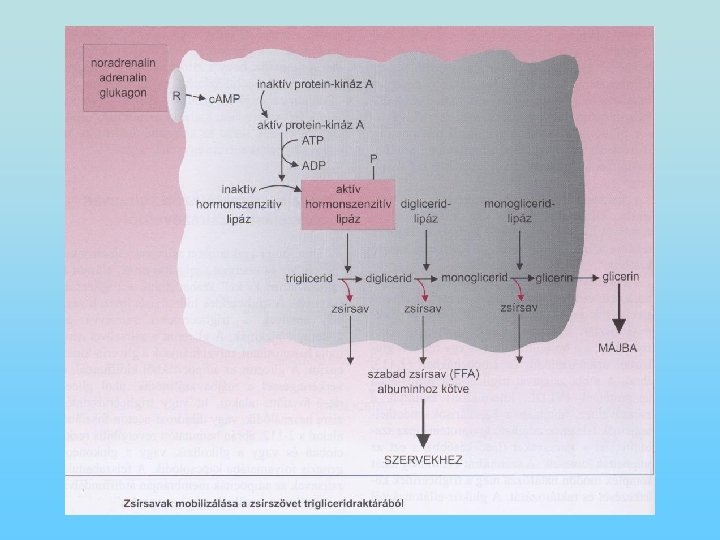 Lipolízis-a raktározott zsírsavak mobilizálása a zsírszövetből • Ahhoz, hogy a raktározott zsírsavak eljussanak a szervekhez és energiát szolgáltassanak, először ki kell szabadulniuk a triglicerid raktárból. • A triglicerideket zsírsavvá és glicerinné a lipázok alakítják. • A glicerin az adipocitákból kidiffundál, a vérkeringéssel a májba szállítódik. • A zsírsavak az adipociták membránján átdiffundálva a vérpályába kerülnek, ahol albuminhoz kötődnek és szabad zsírsavként szállítódnak a szervekhez. • Zsírsavak mobilizálódnak a zsírszövetből, amikor a vércukorszint csökken (éhezés alatt). Étkezések után a zsírsavak trigliceridraktárba épülnek be.