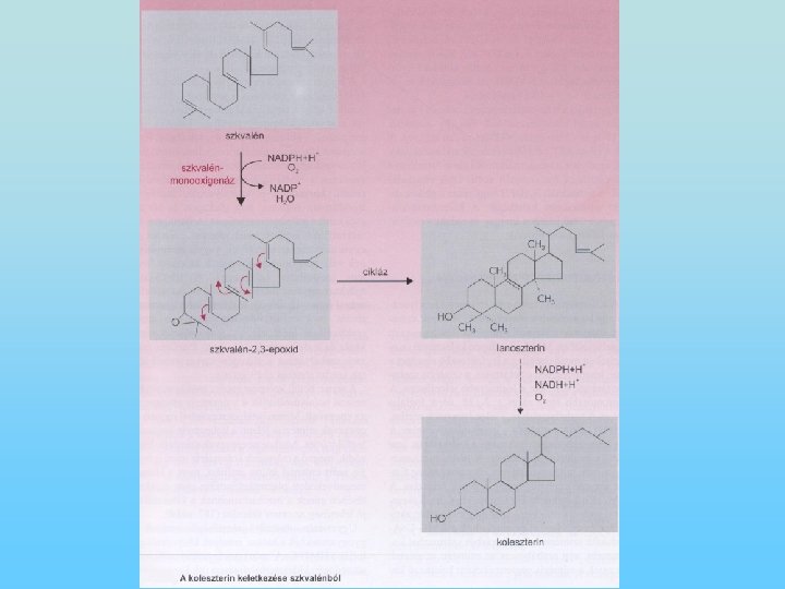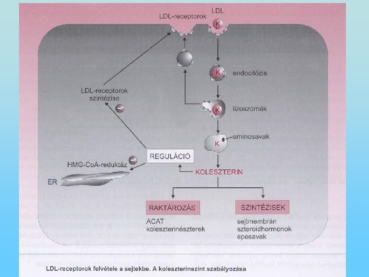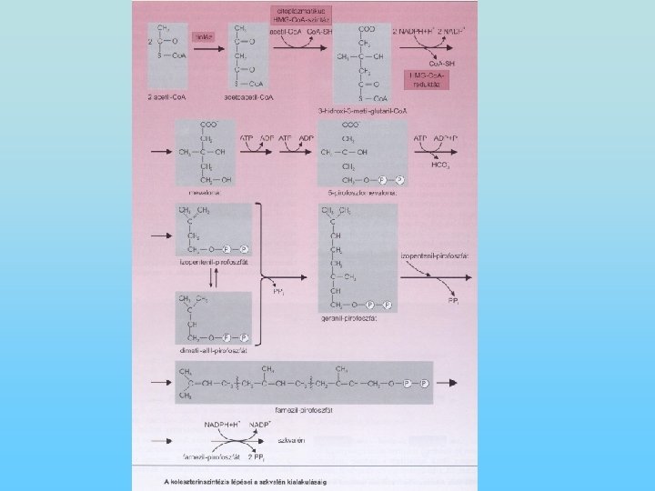 A koleszterin szintézise és szabályozása • • A koleszterin 2 forrásból áll rendelkezésre; részben a táplálékkal kerül a szervezetbe, részben szintetizálódik. Koleszterin-szintézis a májban, a mellékvesében, az ovariumban, a testisben és a bélhámsejtekben szintetizálódik. A szintézis a sejtek citoplazmájában megy végbe. A szintézis acetil-Co. A-ból indul ki, különböző intermediereken keresztül kialakul a mevalonsav, majd a szkvalén jön létre; a szkvaléngyűrű záródásával kialakul a koleszterin. Amikor a táplálékkal elfogyasztott koleszterin mennyisége megnő, a májban csökken a koleszterin szintézise. Alacsony koleszterin-tartalmú étrend mellett a szintézis fokozódik. A koleszterin-szintézist hormonok is szabályozzák: inzulin és trijódtironin fokozza, míg glukagon és kortizol csökkenti a szintézist.