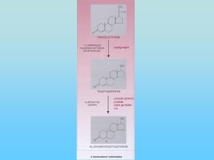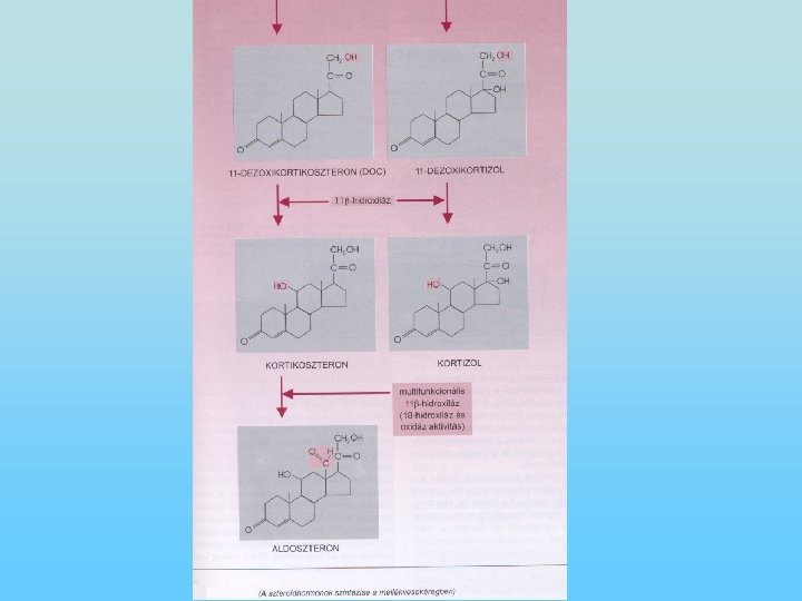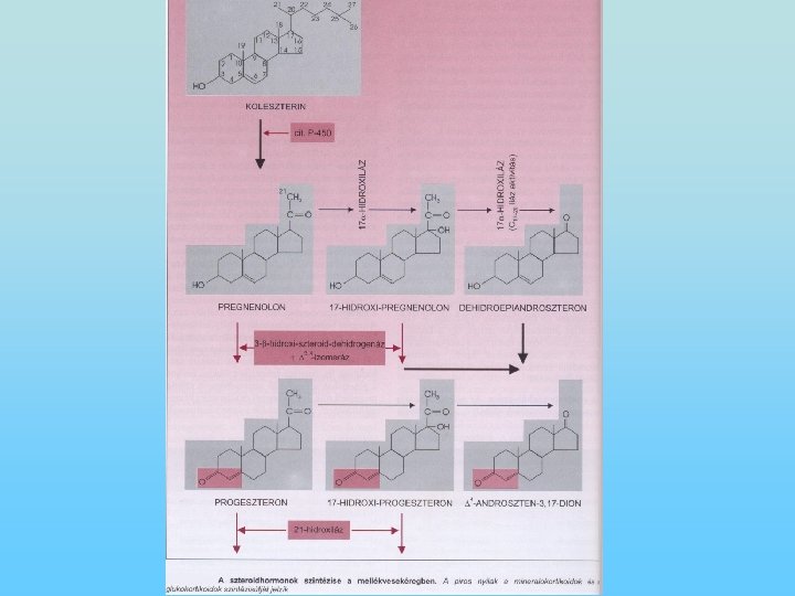 A szteroidhormonok metabolizmusa • Ide tartoznak: glukokortikoidok (szénhidrát-anyagcserét befolyásolják), mineralokortikoidok (ásványi anyagcserét) és a nemi hormonok (nemi működéseket). • A gluko-és mineralokortikoidok a mellékvesekéregben, a nemi hormonok a gonádokban keletkeznek. • Szerkezetükben közös a szteránváz. • Minden szteroidhormon szintézise a koleszterinből történik, amelyből enzim hatására pregnenolon, majd progeszteron keletkezik. A mellékvesekéregben a progeszteronból vagy mineralokortikoidok vagy glukokortikoidok képződnek. • A koleszterin a citoplazmából a mitokondriumba transzportálódik és itt történik a koleszterin pregnenolon átalakulás. • A szteroidhormonok membránpermeábilis molekulák, amelyek diffúzióval távoznak a sejtekből. • A mineralokortikoidok albuminhoz, a glukokortikoidok transzkortinhoz kötődve szállítódnak.