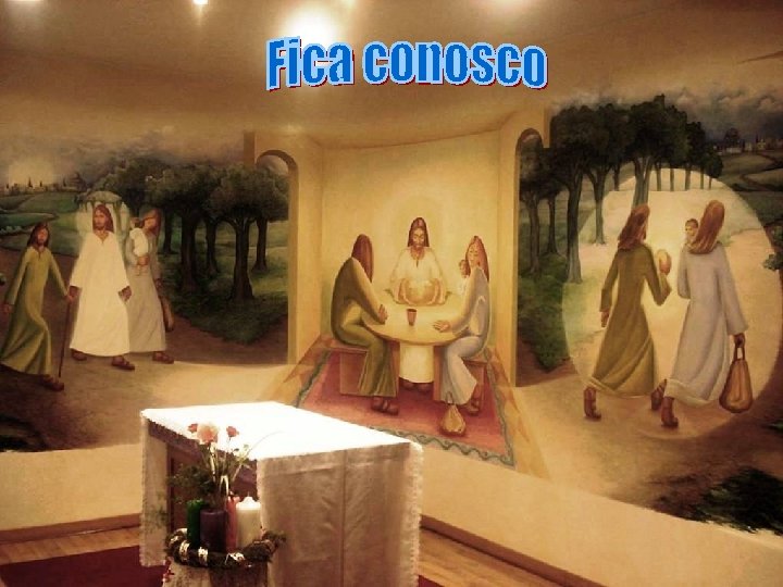 - No final, os discípulos chegam em casa e fazem um CONVITE: "Fica conosco". Querem prolongar a agradável companhia. Após ter acolhido a PALAVRA do Peregrino, oferecem HOSPEDAGEM em sua casa. . . Ele aceita. . . não apenas para "passar a noite", mas para "ficar com eles". - À mesa: UM GESTO CONHECIDO: o gesto da última ceia, quando Jesus instituiu a Eucaristia.