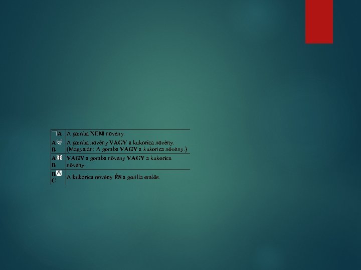A diszjunkció • Jele: • Ha két vagy több ítéletet összekapcsolunk a VAGY kötőszóval, új ítéletet kapunk. Ez a logikai művelet a diszjunkció. Egy diszjunkció logikai értéke akkor igaz, ha a benne szereplő ítéletek közül legalább az egyik igaz. Egyébként hamis. Példa: r: A kukorica növény. s: A kukorica állat. A kukorica növény, tehát az állítások közül az első igaz. A kukorica nem állat, tehát a második állítás hamis. Így a "kukorica növény vagy állat" állítás igaz lesz, mivel legalább az egyik teljesült. •