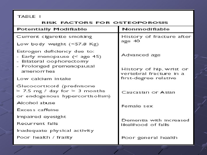 Osteoporosis Systemic disease Low bone mass Micro-architectural deterioration of bone tissue Increased fragility Increase risk of fracture WHO – T-score lower than -2. 5
