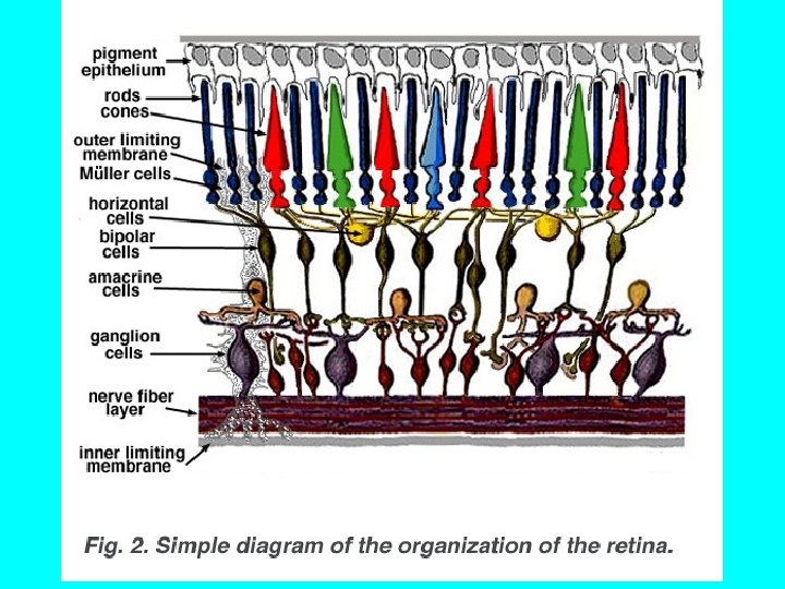 Fényérzékelés • A retinát a pigmenthám rétege borítja: - elnyeli a retinán átmenő fényt (→ a fény visszaverődését, szóródását megakadályozza) - a fotoreceptorok anyagcserefolyamatait segíti • a fotoreceptorok a retina külső rétegében helyezkednek el => az őket belülről fedő idegsejtek áttetszőek