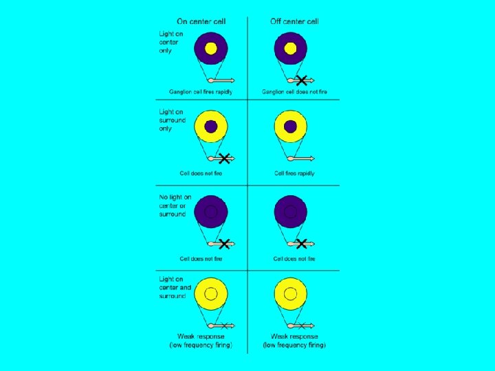 • 2 féle ganglionsejt: akkor ad maximális választ, ha - 1) a központot megvilágítják ÉS a környéket nem, - 2) a központ sötétben van, ÉS a környéket éri fény • „BE” központú és „KI” központú (ON/OFF) ganglionsejtek: a központ és a szélső rész ellentétesen működik