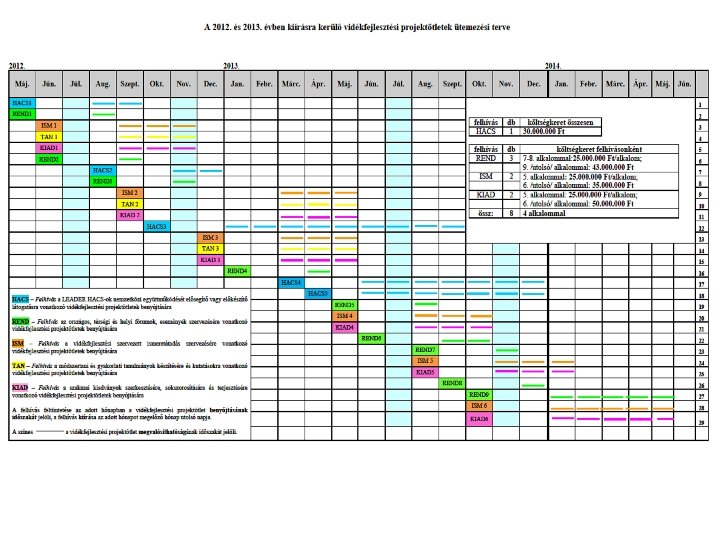 Projektötletek 5 témakör: Ø LEADER Helyi Akciócsoportok nemzetközi együttműködését elősegítő vagy előkészítő látogatásra (7 alkalommal nyílt meg: 2011. augusztus, 2012. január, május, augusztus, október, 2013. március, április) Ø Sokoldalú fenntartható vidékfejlesztéssel kapcsolatos országos térségi és helyi fórumok, események szervezése (6 alkalommal nyílt meg: 2012. május, június, augusztus, 2013. január, május, június) Ø Sokoldalú fenntartható vidékfejlesztéssel kapcsolatos ismeretátadás szervezésére (4 alkalommal nyílt meg: 2012. június, szeptember-október, december, május) Ø Sokoldalú fenntartható vidékfejlesztéssel kapcsolatos módszertani és gyakorlati tanulmányok készítésére (3 alkalommal nyílt meg: 2012. június, szeptember-október, december) Ø Sokoldalú fenntartható vidékfejlesztéssel kapcsolatos szakmai kiadványok szerkesztésére, készítésére, sokszorosítására és terjesztésére (4 alkalommal nyílt meg: 2012. június, szeptember-október, december, május)