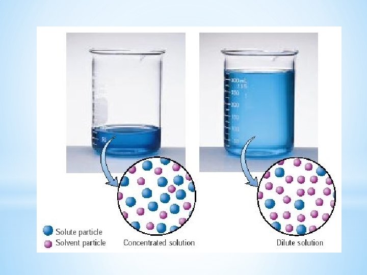 * * A measure of the amount of solute that is dissolved in a given quantity of solvent. * A dilute solution is one that contains a small amount of solute. * A concentrated solution contains a large amount of solute. When a concentrated solution is diluted, the amount of solute doesn’t change. *