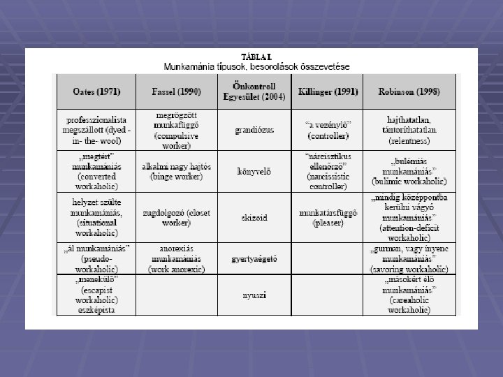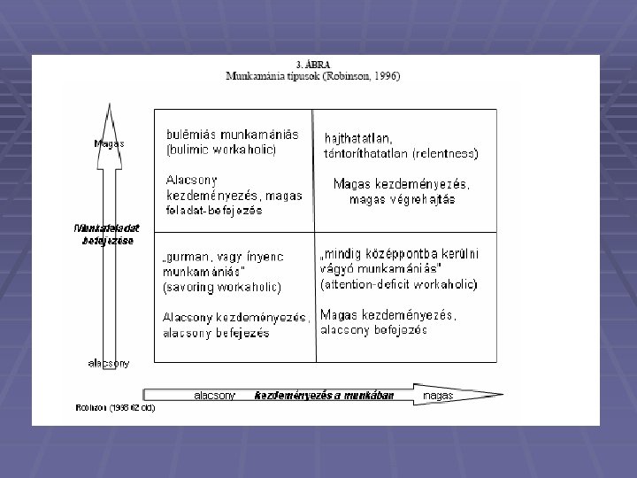 A munkafüggő családi élete § 1. ) A munkafüggők a következő okok miatt fordítanak irreálisan sok időt a munkavégzésre: félnek az intimitástól, a szexuális felsüléstől, bármely családi „megmérettetéstől” § 2. ) A munkafüggők jellemzően eltérő személyiségű házastársat választanak maguknak. § 3. ) Irreálisan magas elvárásaik vannak házasságuk, családjuk sikerességét illetően. § 4. ) Gyermekeik előrehaladását, sikerességét sokkal komolyabban veszik, mint mások. § 5. ) A szabadidőt tipikusan megtöltik feladatokkal. § 6. ) A gyermekek megtanulják, hogy a játék nem Oké. § 7. ) A családban őszintétlen hangnem uralkodik. Nem azt mondják, amit éreznek. § 8. ) Elfelejtik a családi ünnepeket (névnap, születésnap, házassági évfordulók). § 9. ) a házasságon belüli ellentéteket agresszív-szubmisszív elkerülési módokkal és hallgatással, csönddel igyekeznek elkerülni. Azaz egyszerűen nem beszélnek a házastársukkal, főként a saját közös életükről nem. A családtagok közötti kommunikáció áttételes (Közvetítő személy kell hozzá vö. „az egyik szülő üzengetése” a másiknak. ) A család tagjai nem hisznek abban, hogy szabadon elmondhatják érzéseiket. Az apa megközelíthetetlen szerepben van. § 10. ) Másokhoz képest gyakrabban köteleződnek el extra házastársi feladatokkal, miközben a párjuk erre nem vágyik. § 11. ) Ritkábban élnek nemi életet házastársukkal. § 12. ) Veszélyeztetettebbek az alkoholizmussal, mint a nem munkafüggő társaik. § 13. ) A leggyakoribb szexuális problémáik: érzelmi aszinkronitás a párjukkal, az intimitás, a vágyakozás hiánya, érzelmi gátoltság, az orgazmusra való képtelenség. Robinson 1998 148 -149. old. és Killinger 1991 9 -14. old